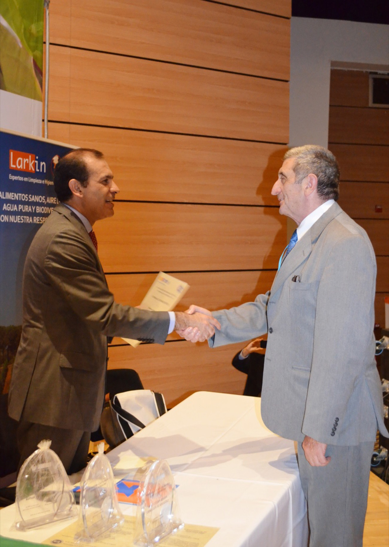 Juan Manuel  Niño,  Gerente de Larkin, hace entrega del    III  Premio ACTA a la Contribución de toda una vida en inocuidad de alimentos al  ganador , Dr. Alfonso Arenas Hortúa.