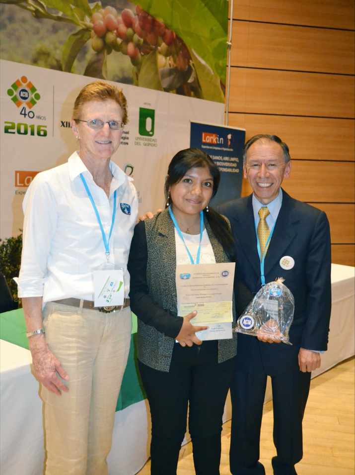 Bernadette Klotz del Instituto Alpina entregó el Primer puesto del IX Premio ACTA a la Investigación en Ciencia y Tecnología de Alimentos  en la categoría de pregrado a Liliana Serna C, Adriana Micanquer C. y Alfredo Ayala  A, por el trabajo  titulado “Doble emulsión  y coacervación compleja en la encapsulación de estevia” de la Universidad de Nacional de Colombia Sede Palmira y la Universidad del Valle. Los acompaña en la foto a la derecha, Jorge Cabrera-Director del Premio ACTA.