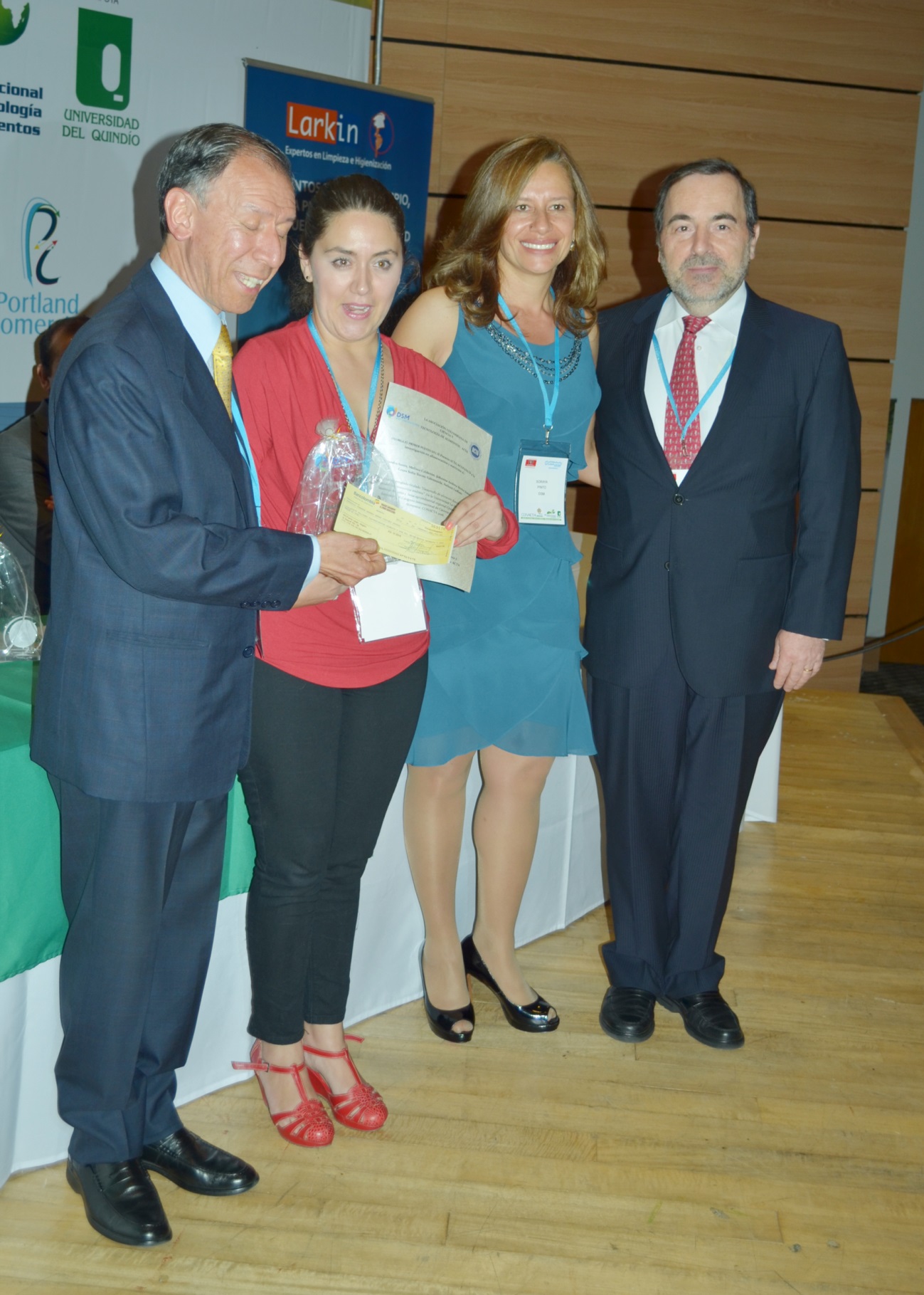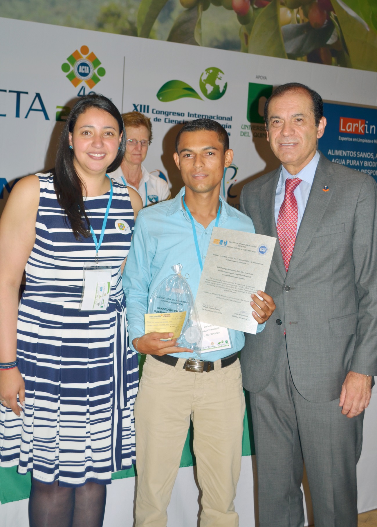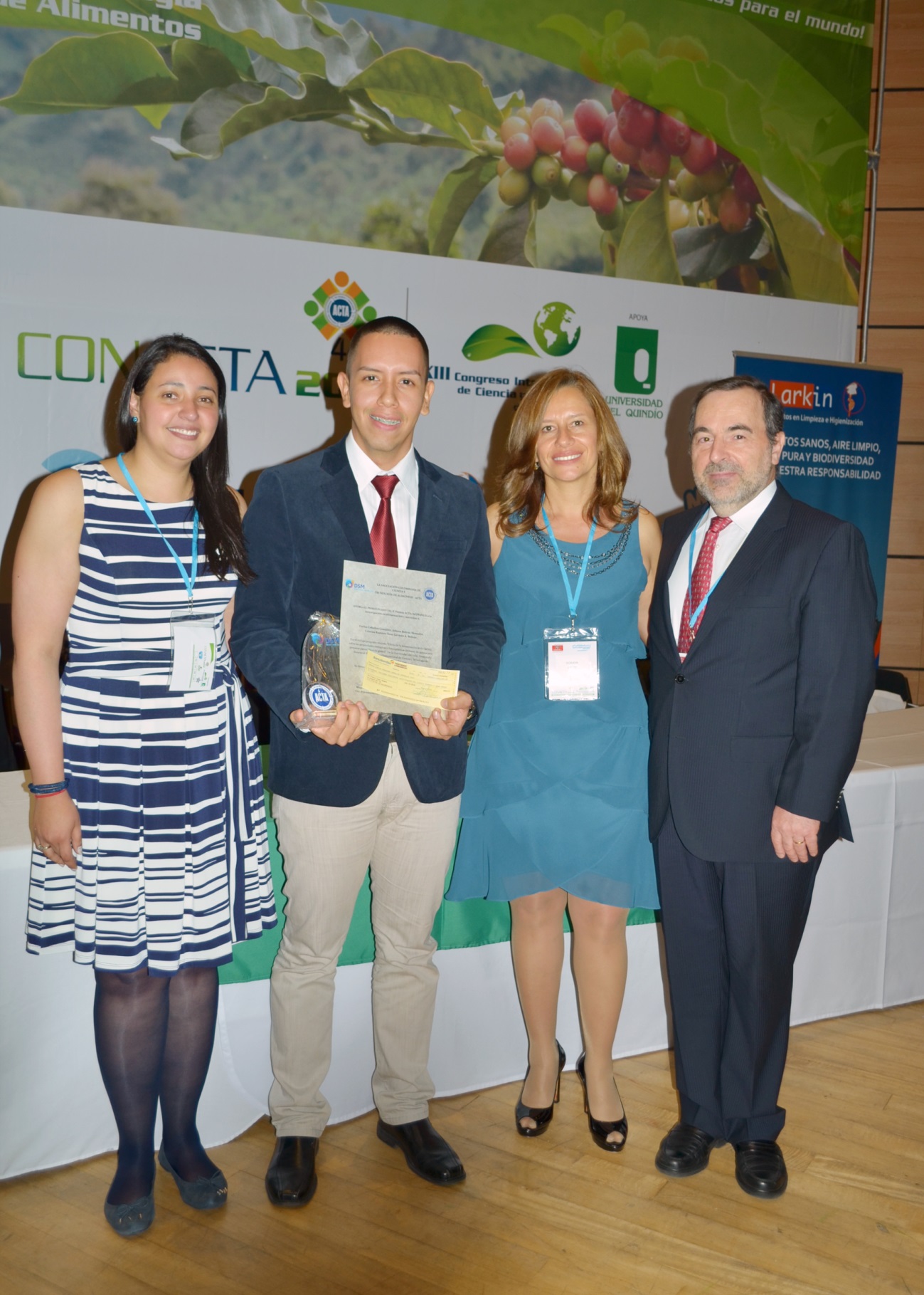 Entrega del   II Premio ACTA/ACOFANUD al  Primer puesto a la Investigación  en Alimentación y  Nutrición   en la categoría posgrado,  otorgado a  Carlos Ceballos, Johana Bolívar , Cristina Ramírez  y  Germán A. Bolívar   de la  Universidad del Valle,  por el trabajo titulado “ Efecto de la fermentación ácido láctica  sobre las propiedades reológicas y fisicoquímicas  de masas de quinoa para preparar panes  libres de gluten”. En la foto aparece de izquierda a derecha Jorge Cabrera,  uno de los autores del trabajo ganador del premio,  Soraya Pinto de DSM Colombia y Héctor Cori de DSM Chile.
