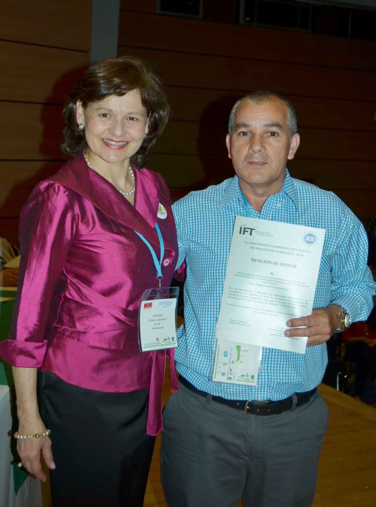 Entrega del Primer puesto del IV Premio ACTA a la Investigación  en Inocuidad de Alimentos  en la categoría posgrado,  otorgado a Juan David Sánchez y María del Pilar Delgado  de la  Universidad Libre ,   el LEMA y el LDMB por el trabajo titulado “ Aislamiento e identificación de Aeromonas spp. B-hemolíticas y Vibrio spp.,  potencialmente virulentos en pescados  y mariscos comercializados en Bogotá-Colombia”